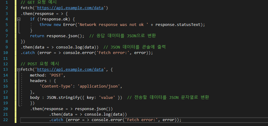 - fetch(url, options): 요청할 URL과 추가 옵션을 전달하여 데이터를 가져옵니다. GET 요청의 경우 기본 설정으로 사용하면 되고, POST 요청의 경우 method, headers, body 옵션을 추가합니다.