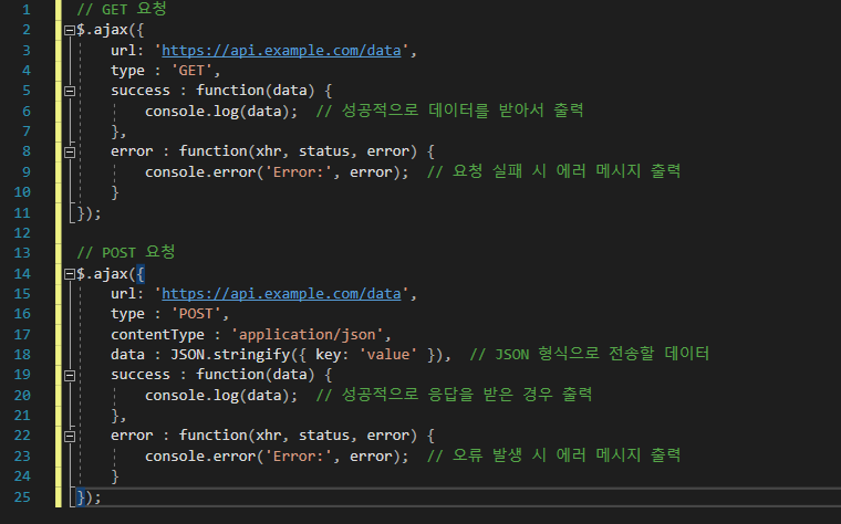- **success**와 error: 요청 성공 및 실패 시 실행할 콜백 함수를 설정합니다.