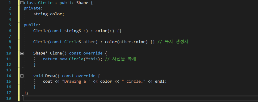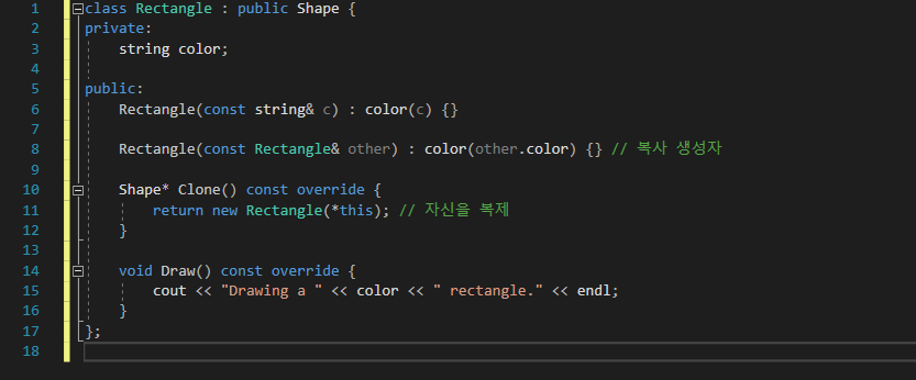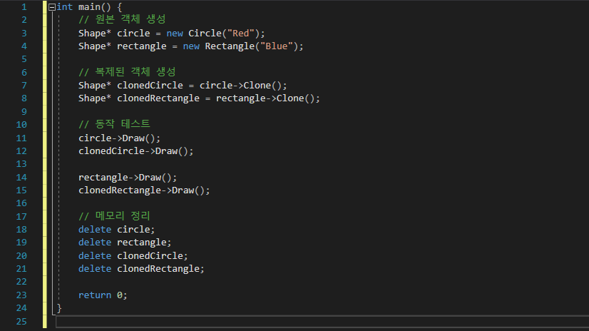 - 클라이언트는 원본 객체(circle, rectangle)를 복제(clonedCircle, clonedRectangle)하고, 복제된 객체가 원본과 동일한 동작을 수행하는지 확인합니다.