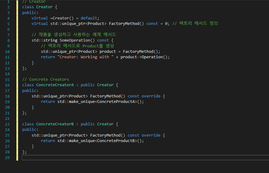 | [C++] 팩토리 메서드 (Factory Method) 패턴 설명 및 사용 예제 (0) | 2024.11.15 |