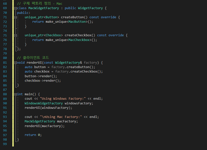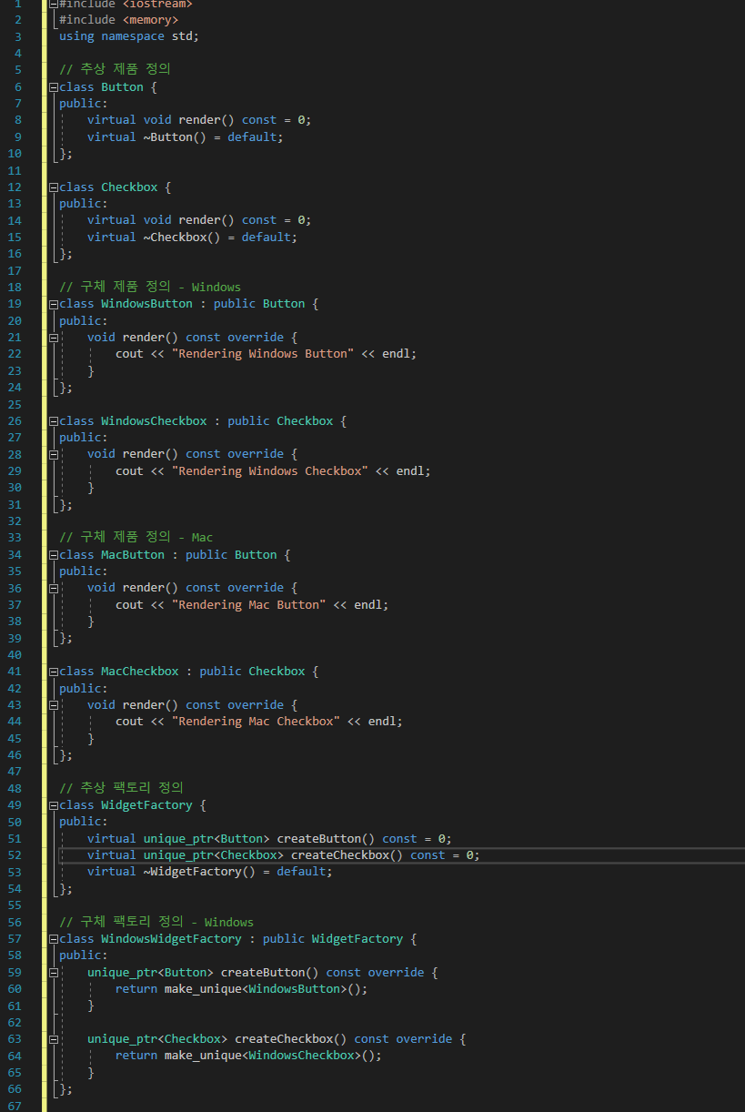 | [C++] 추상 팩토리 (Abstract Factory) 패턴 사용 설명 및 예제 (0) | 2024.11.20 |