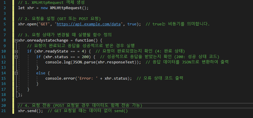 XMLHttpRequest 객체는 브라우저에서 서버와 데이터를 주고받기 위해 제공하는 API입니다. 기본 구조는 다음과 같습니다.